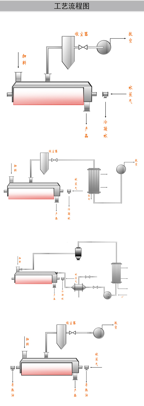 3、處理物料范圍廣:使用不同熱介質,即可處理熱敏性物料,又可處理需要高溫處理的物料。 常用介質有:水蒸氣、大熱有、熱水、冷卻水等。即可連續操作也可間歇操作,可在很多領域應用。